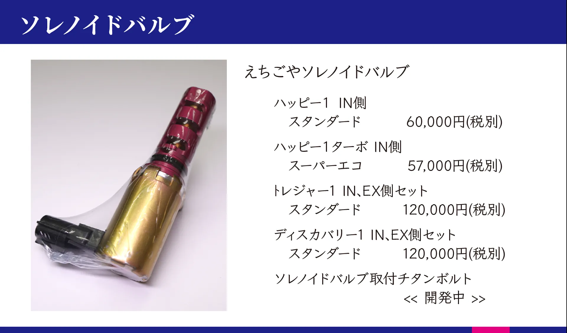 このえちごやソレノイドは、制御モーターの出力改善と内部構造の適正化によってエンジンコンピュータからの信号を正確かつ精密に動作させ、エンジン本来が持つポテンシャルを引き出します。